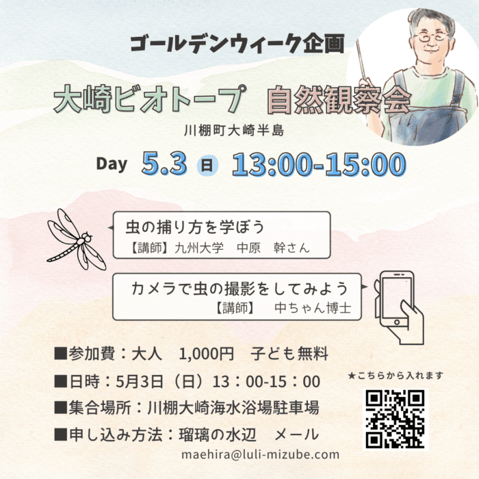 GW企画!大崎ビオトープ自然観察会 2026年05月03日 〜 2026年05月03日 受付中 自然・歴史 大崎半島 自然観察 湿地帯 大崎ビオトープ 更新日:2026.04.23 瑠璃の水辺 編集部 大崎半島でニホンアカガエルの生息している湿地帯を環境整備している大崎ビオトープ湿地を守ることでここには多くの生きものが集まるようになりました。トンボやバッタ、チョウチョなど。そんな虫たちを観察してみませんか?中ちゃん博士と、生きものに詳しい大学生が教えてくれます。 開催期間 2026年05月03日 〜 2026年05月03日 料金 大人1000円 こども無料 申し込み期限 2026年05月01日 このイベントへのお申し込みはこちら 備考 汚れてもいい長靴を持参ください。