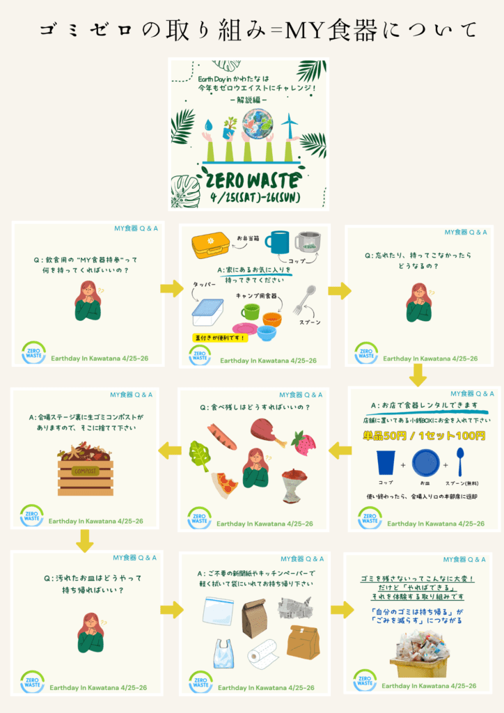 来場者様は飲食用のマイ食器、マイタッパーを持参するか、会場にてレンタル食器をご利用ください。