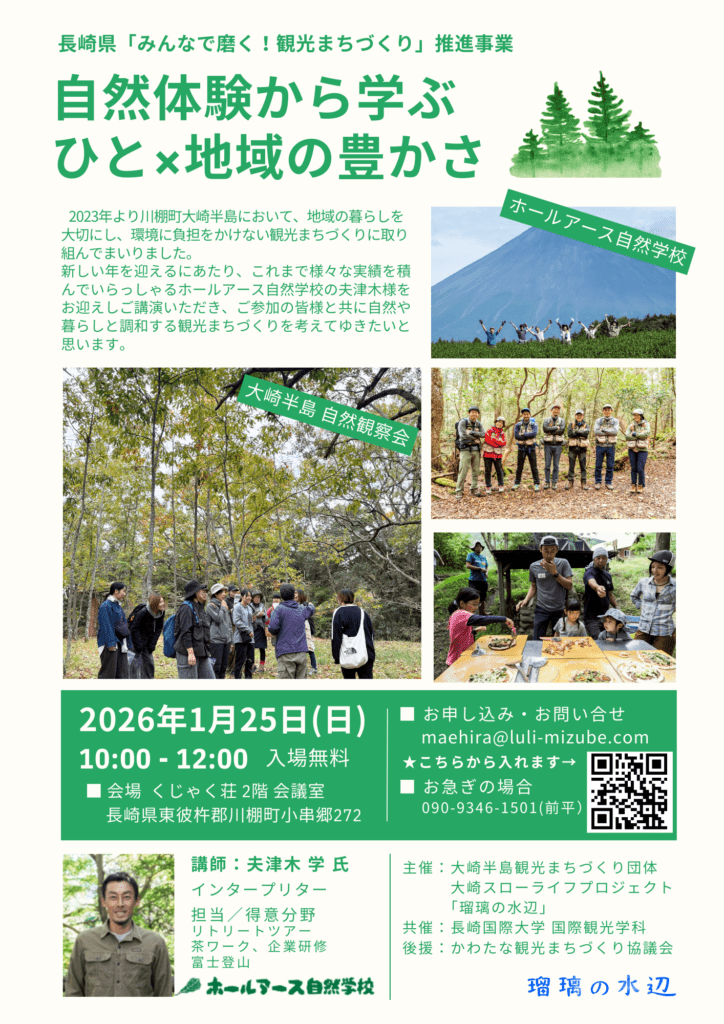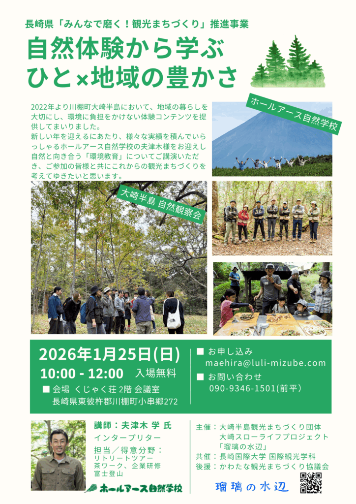 新しい年を迎えるにあたり、様々な実績を積んでいらっしゃるホールアース自然学校の夫津木様をお迎えし、自然と向き合う「環境教育」をベースに幅広くコンテンツを提供されている事業について講演いただき、ご参加の皆様と共にこれからの観光まちづくりを考えてゆきたいと思います。